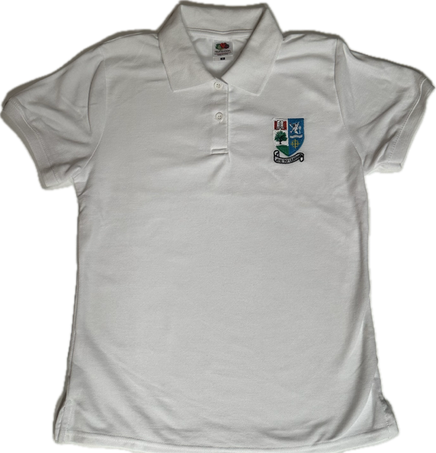 SS86 Fruit of Loom Girls White Fitted Poloshirt Inc Crest Embroidered Logo